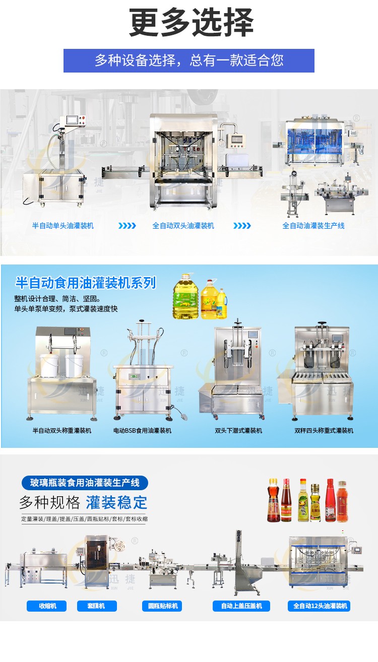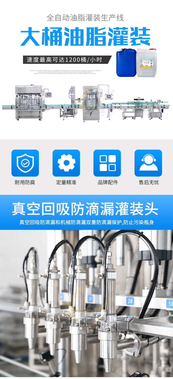全自動油脂灌裝生產線適用于灌裝各種油類及粘稠液體,如花生油、調和油、菜籽油等食用油的灌裝??筛鶕嘌b需求定制機型。