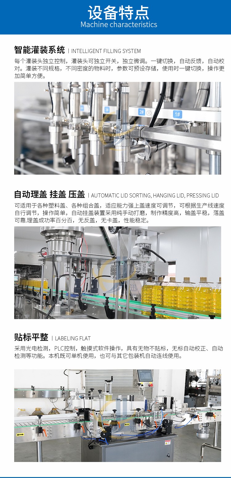 食用油灌裝生產(chǎn)線2-16頭可定制,兼容6種瓶型,容量范圍內(nèi)可兼容多種瓶型的灌裝,一鍵式操作,開機即能使用。