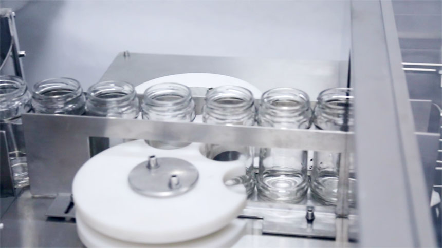 設備介紹:醬類灌裝線配套廣口玻璃瓶洗瓶機具有性能可靠、操作簡單、清洗效果良好、工作效率高等特點,主要由不銹鋼水泵、高壓噴頭、電器箱等組成。它的工作原理是先將需要清洗的瓶子裝進瓶盤內,然后人工送入工位,通過循環水噴將需要清洗的瓶子注滿水沉至清洗槽先進行簡單的粗洗。然后瓶子會上升推進洗瓶機的第二工位,在第二工位會進行三次仔細的清洗,在經過三次氣沖、甩干,再自動進入到滅菌烘箱。清洗過程為粗洗一次,仔細清洗三次,然后是烘干。