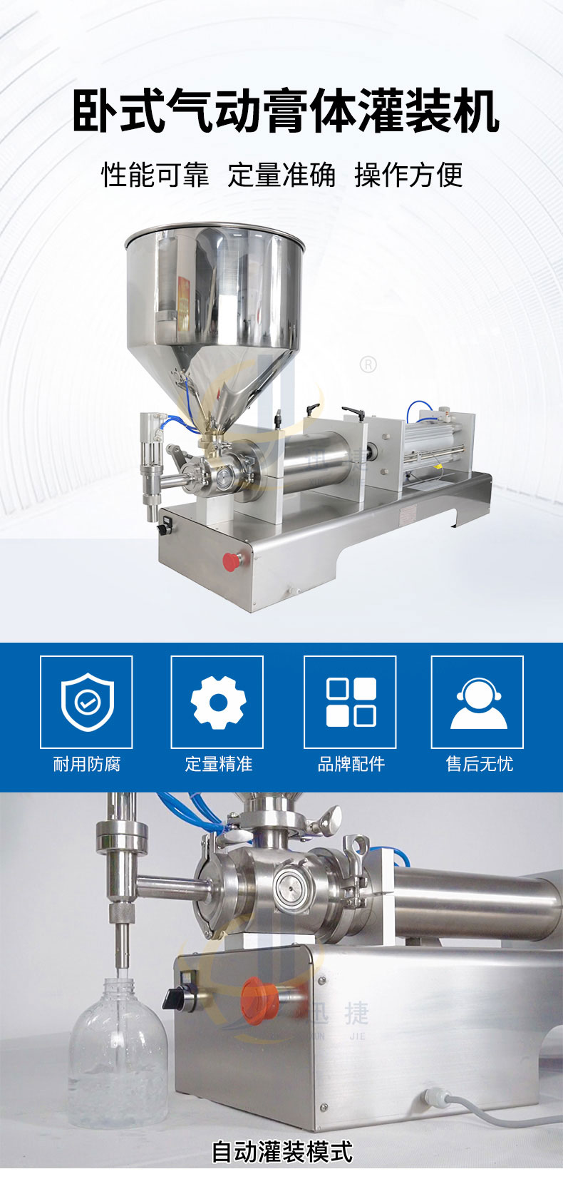 該機(jī)為半自動膏體灌裝機(jī),是日化行業(yè)、醫(yī)藥行業(yè)、食品行業(yè)、油墨行業(yè)和涂料行業(yè)的理想灌裝充填設(shè)備,灌裝悶頭采用防滴漏。