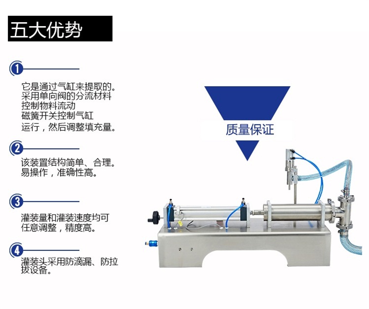 A、該設(shè)備通過氣缸帶動一個(gè)活塞來抽取和打出物料,用單向閥控制物料流向,并以磁簧開關(guān)控制氣缸的行程,即可調(diào)節(jié)灌裝量。
